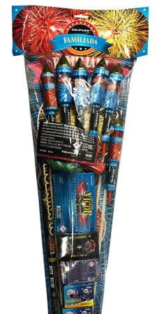 Zestaw zawiera: 6 rakiet, 4 op. różnych petard, 2 op. pchełek, 1 rzymski ogień, 1 bateria petard błyskowych, 1 op. trzaskających kulek, 1 op bączków, 2 strzelające serpentyny.